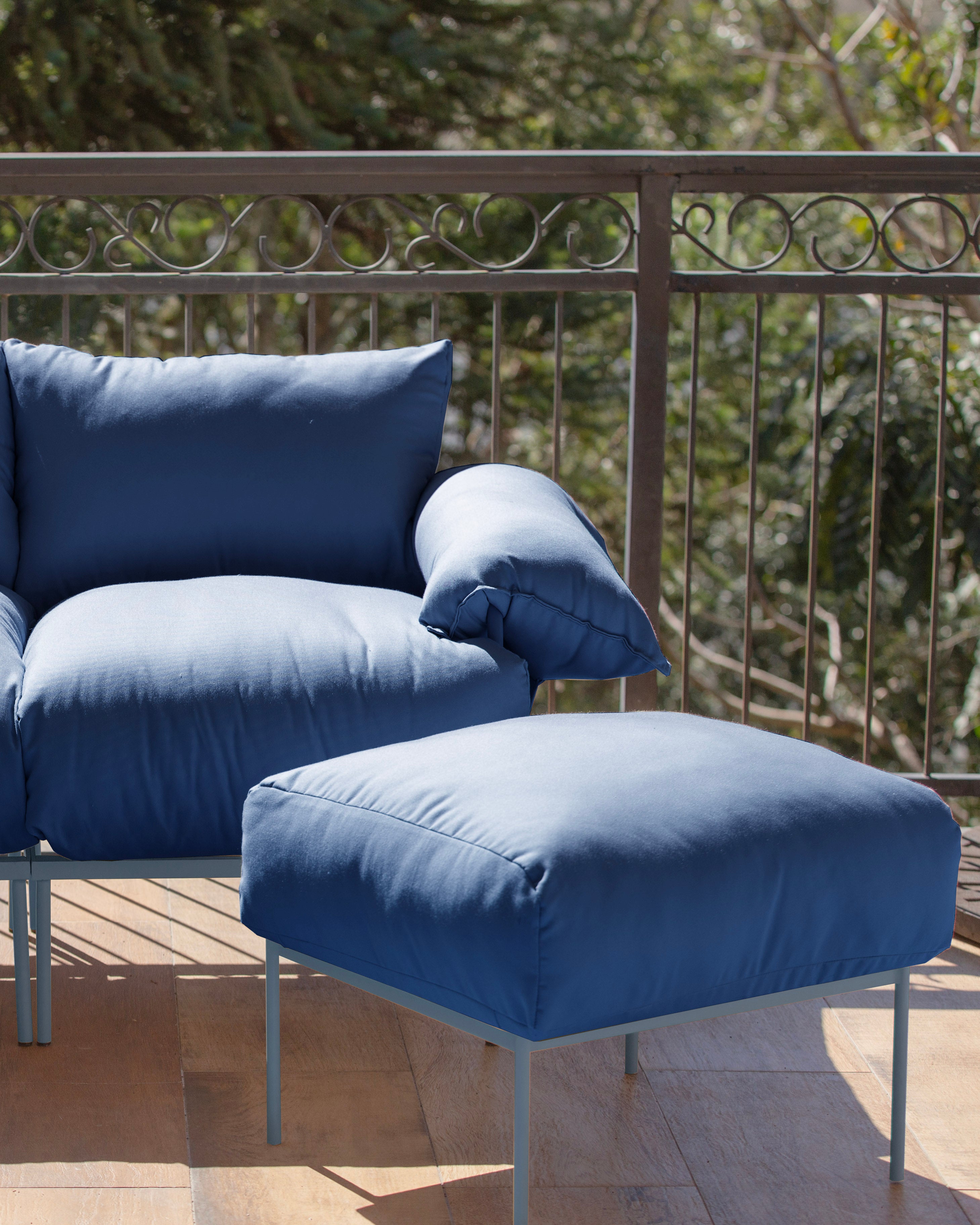 Puff Asa em alumínio e compensado naval com tecido resistente à umidade, especialmente desenvolvido para ambientes molhados como piscinas e saunas. A combinação de azul marinho com metal azul névoa cria uma paleta sofisticada que captura a essência do verão, elevando a estética de qualquer espaço externo com elegância e funcionalidade.